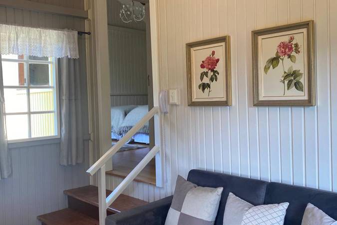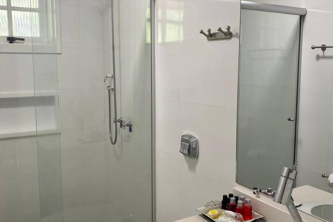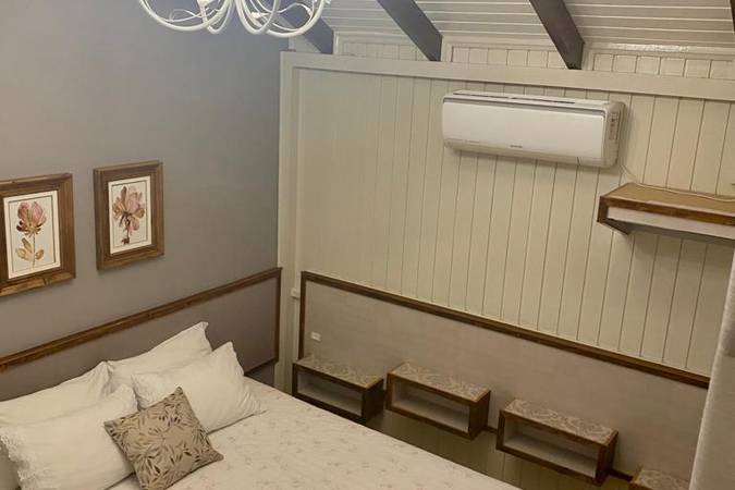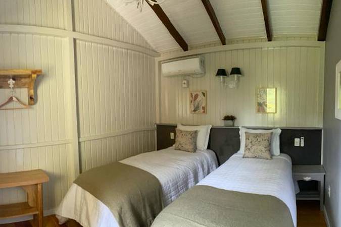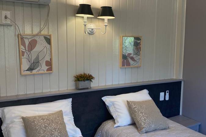 O Chalé Família número 2 conta com 2 quartos independentes, para até 4 pessoas, um com cama Box Queen e outro com 2 camas de solteiro que podem virar uma cama de casal, além de banheiro privativo e sala com sofá e lareira.