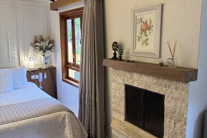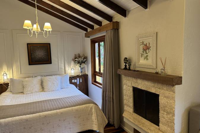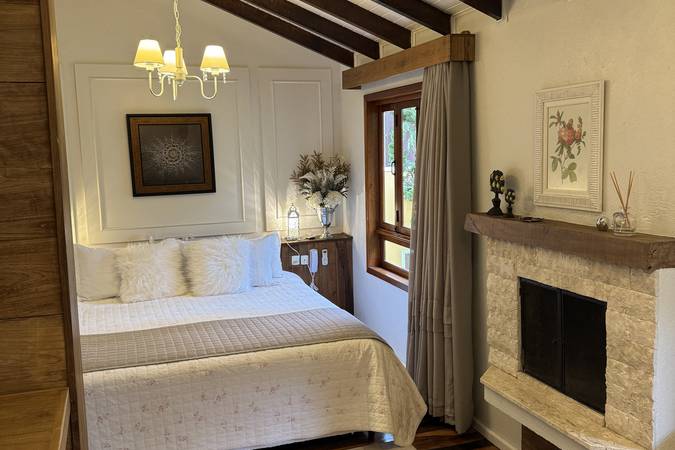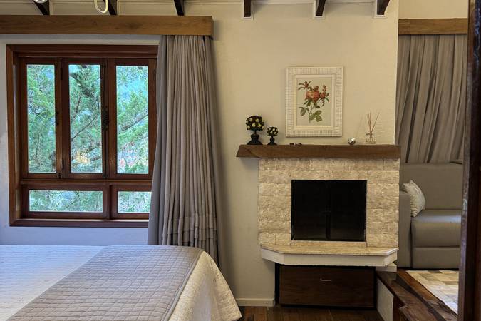 Além do quarto aconchegante com lareira para aquecer os dias frios, há uma sala integrada com sofá, mesa e cadeiras.