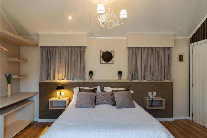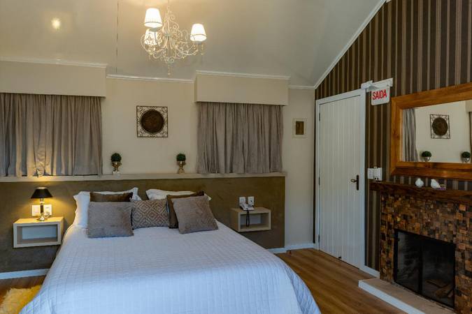 O conforto da cama de casal Queen Size, a sala com lareira a lenha integrada ao ambiente e a banheira de hidromassagem triangular, com vista para o lago deixa qualquer casal apaixonado pelo Chalé e com uma estadia perfeita!
