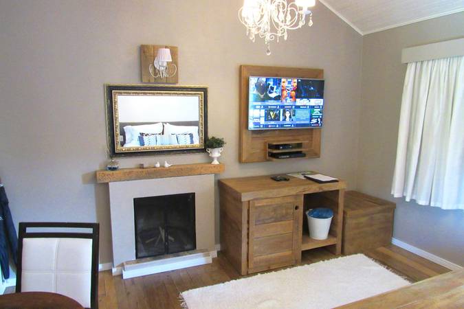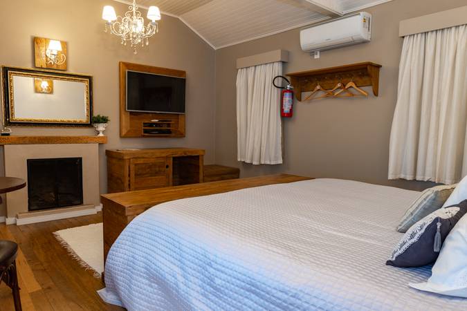 Para deixar o quarto ainda mais aconchegante há uma lareira a lenha para aquecer os dias frios da Serra Catarinense e deixar aquele clima delicioso para curtir momentos especiais.