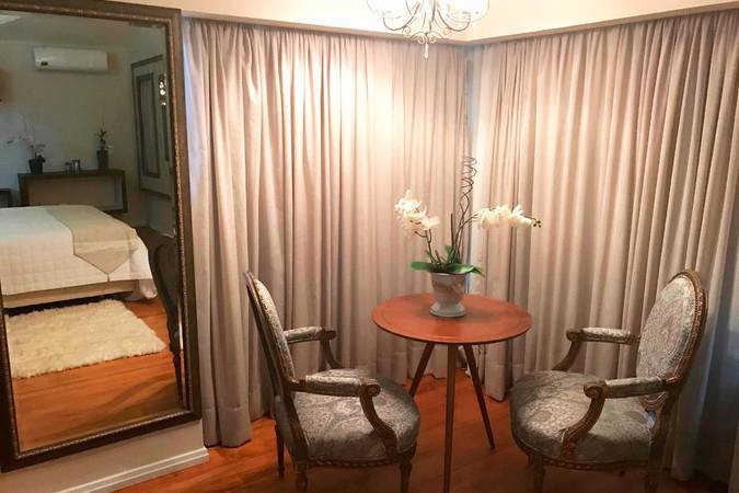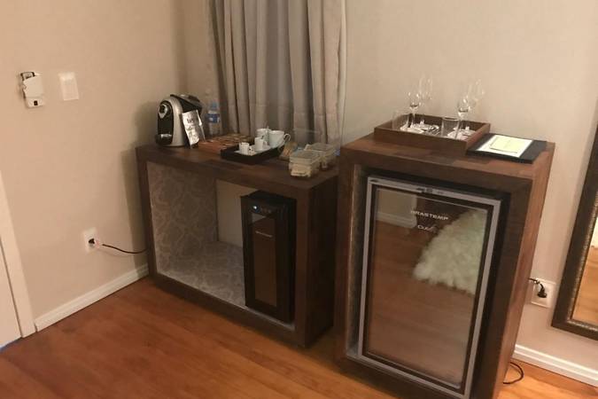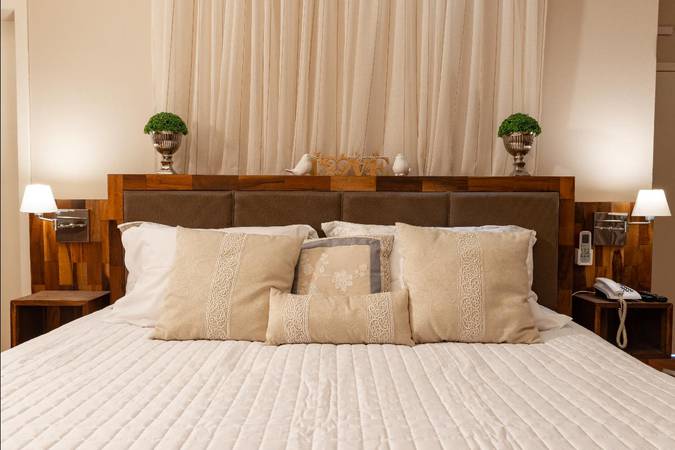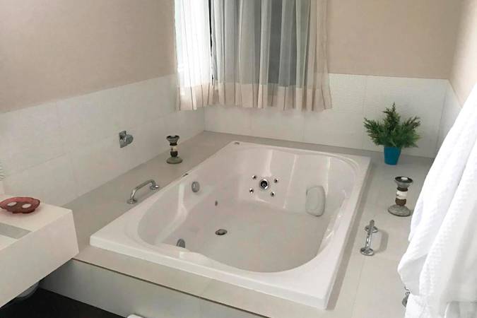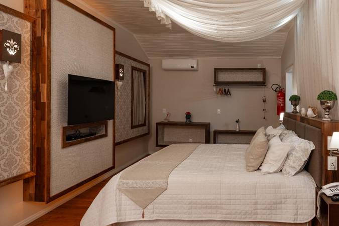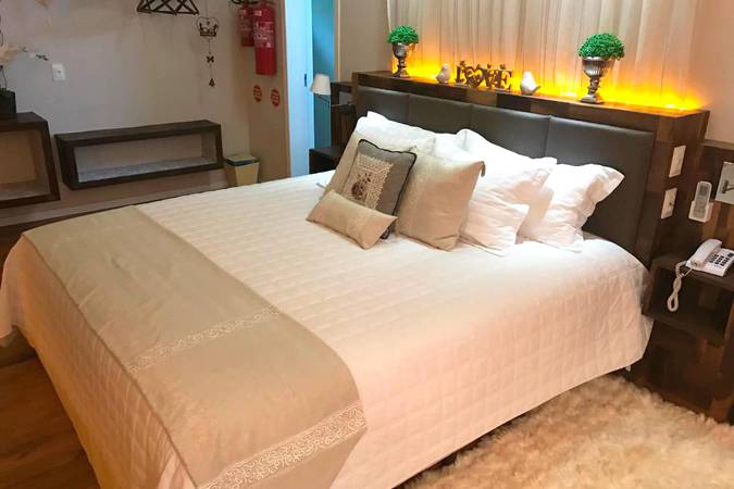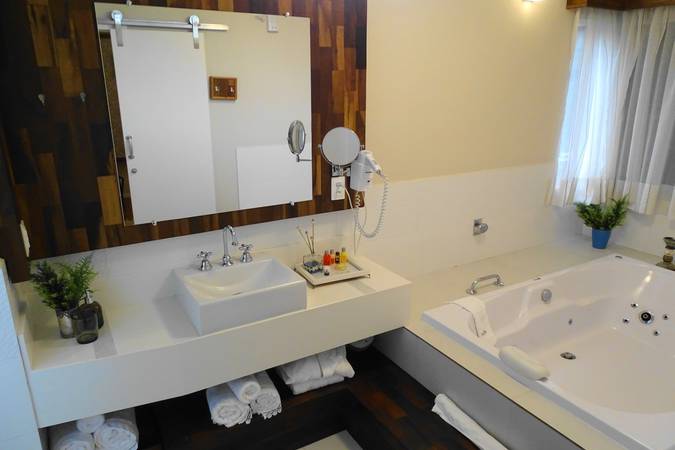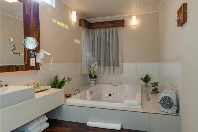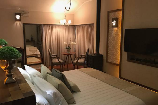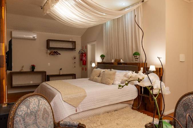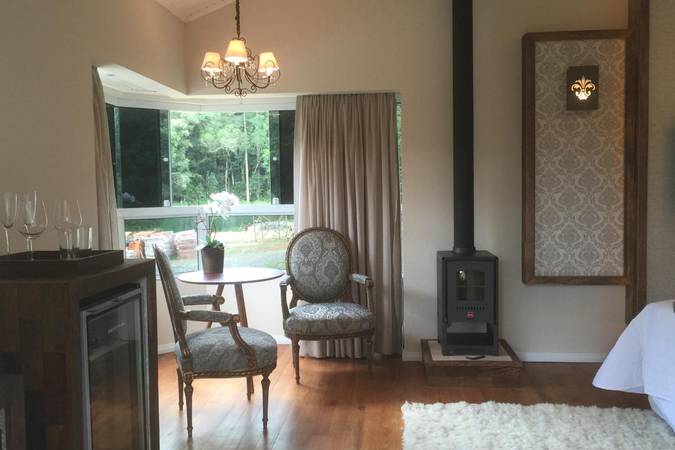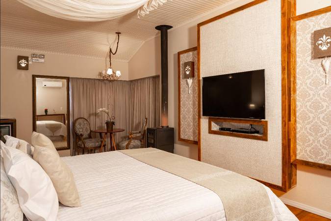 Possui quarto aconchegante com Cama King Size, banheira de hidromassagem dupla e lareira chilena a lenha. Além disso, há outros detalhes na decoração que o deixam perfeitos para celebrar a lua de mel ou datas importantes.
